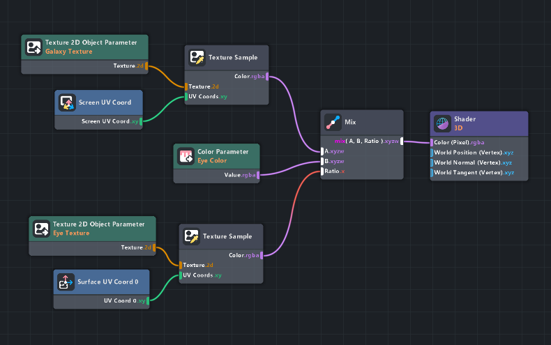 The material for the third eye is relatively simple: it uses a texture mask to determine whether it should show the galaxy background or the eye color. The eye is drawn onto the object normally with the eyeball object’s UVs, but the galaxy uses the screen UVs instead, so it will not follow the rotation of the head at all. I specifically chose this to make the eye seem more “otherworldly”, where it may be attached to the person’s head but is still part of something much larger than itself.