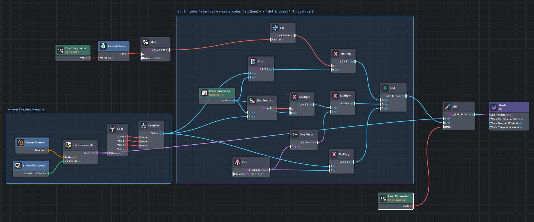 This shader has two exposed variables: a cycle rate and an effect amount. The cycle rate is a multiplier for the elapsed time node that is used as the hue in the equation: