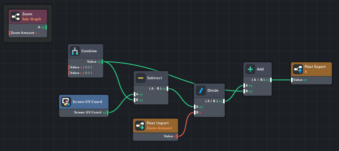 The zoom simply scales the screen UVs to make the camera’s image appear larger/smaller. Some calculation is done so that the zoom happens at the center of the screen, UV = (0.5, 0.5). The zoom amount is left as an exposed variable that can be tweaked; values > 1 will zoom in, while values < 1 will zoom out.