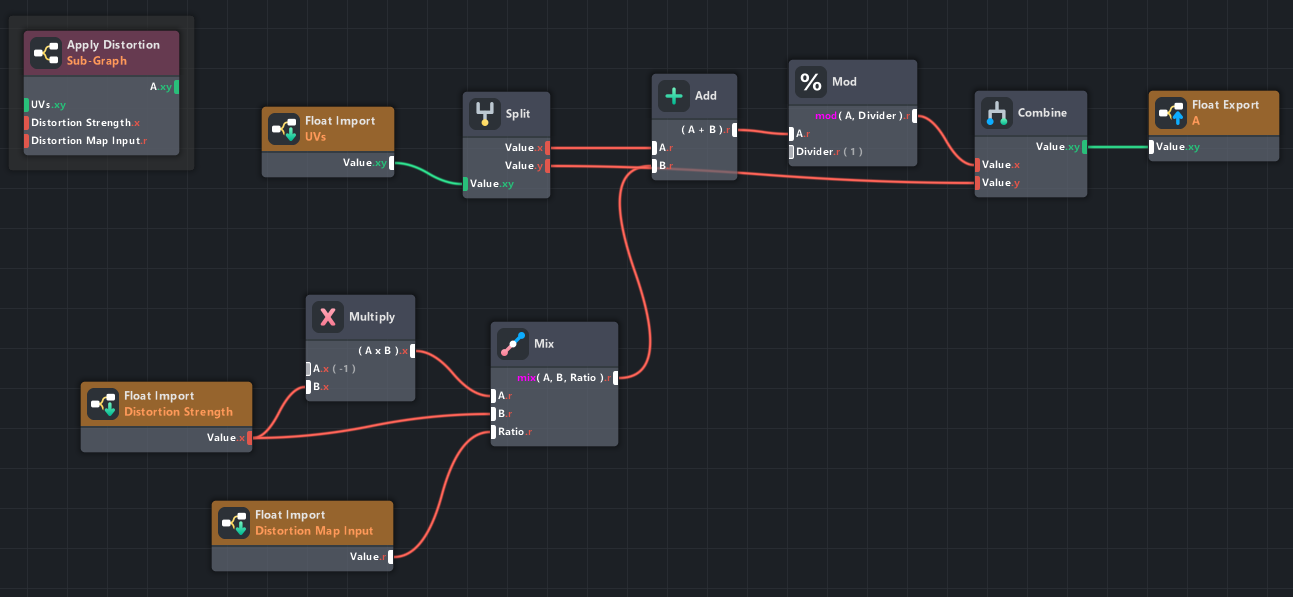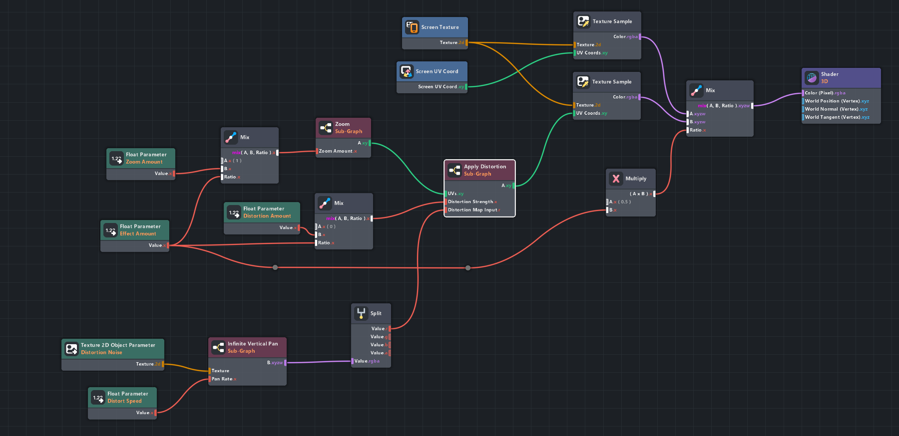 Lastly, the UVs from the zoom + distortion are mixed with the raw camera image to result in the wavy double image. The mix ratio is linked to the overall effect driver variable (halved to clamp between [0, 0.5] for the two images to be equally mixed when the effect is fully active).
